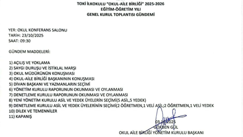 Okul Aile Birliği Yönetim Kurulu ve ya Denetleme Kuruluna aday olmak isteyen velilerimiz Müdür Yardımcısı Yonca TÜRKER’den bilgi alabilirler. Seçimler liste usulü ile yapılacaktır. Okul Aile Birliği Yönetim Kuruluna aday olmak isteyen velilerimizin 22.10.2025 tarihi Saat 12.00’a kadar 5 ASİL ve 5 YEDEK üye listesini Müdür Yardımcısı Yonca TÜRKER’e teslim etmesi gerekmektedir.
